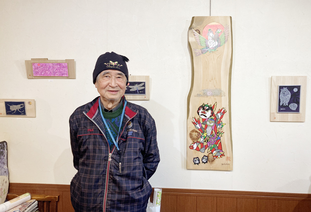 木板絵展を開催している栃久保さん(アートサロンミューズで)