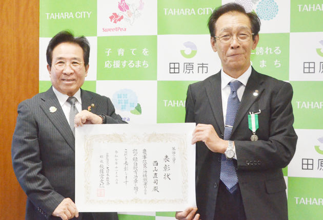 大日本農会(東京)が選定する今年度農事功績者表彰で緑白綬有功章に選ばれた田原市六連町の農家、西山直司さん(63)が19日、同市役所に山下政良市長を訪ね、受章を報告した。西山さんはスイカ栽培の技術改良や経営改善に努め、田原農業懇話会の会長として地域農業の振興に貢献したことなどが評価された。