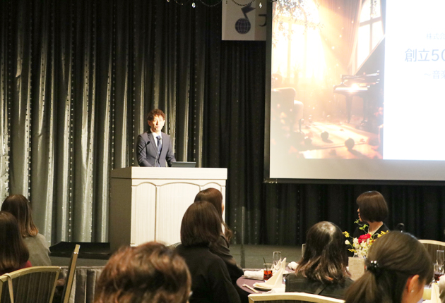 鎌田社長はあいさつで、50周年を迎えられたことに感謝し、音楽講師、調律師、スタッフそれぞれに感謝のメッセージを贈った。