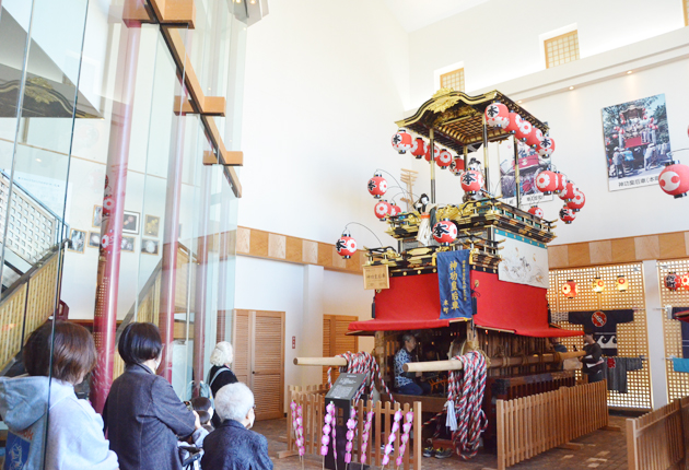 山車を見ながらお囃子を聞く人たち(田原まつり会館で)