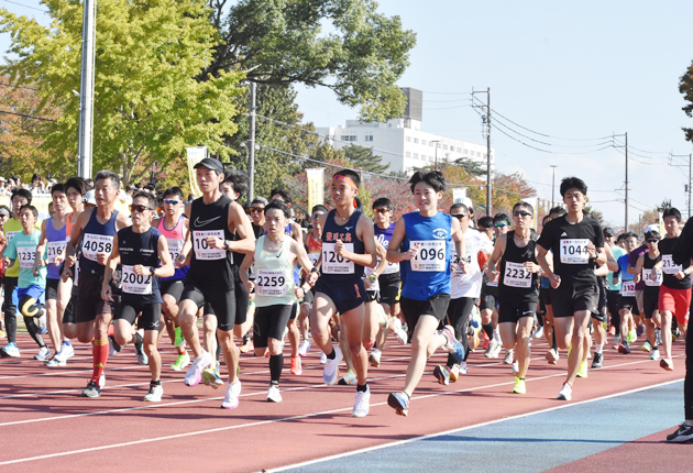 10キロ部門でスタートするランナーたち(OKAKENアスリートフィールドで)