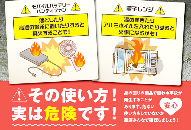 製品にはそれぞれ、正しい使い方や注意事項、寿命があるとして、取扱説明書を確認して正しい方法で使う▽長期使用で経年劣化が生じていないか確認する▽異変を感じたら使用を中止し、製造・販売事業者に相談する―ことを求めている。