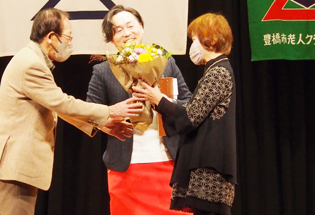 花を贈ったダイヤモンド婚の夫婦(豊橋市公会堂で)