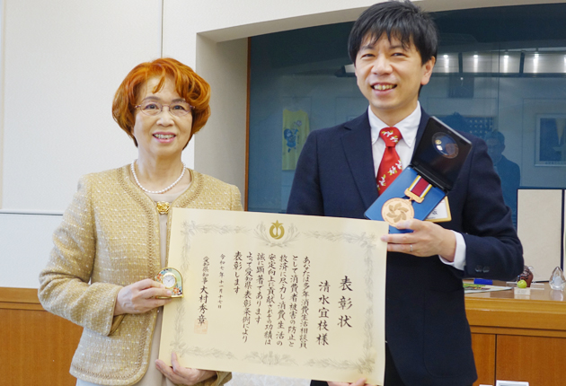 愛知県表彰(社会活動功労者)を受けた東三河広域連合の元消費生活相談員、清水宜枝(よしえ)さん(68)=大府市=が28日、豊橋市役所に長坂尚登市長を訪ね、喜びを報告した。 清水さんは2016年4月から24年3月まで、同連合の消費生活総合セン...