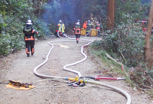 訓練では、消防署と消防団が連携し、延焼阻止線を設定するため、高低差145メートル、総延長約2・5キロにわたる遠距離中継送水を実施した。ホースの延長では、車両の活用や距離測定機能を取り入れ、林道での効率的な延焼阻止線の構築手順を確認した。