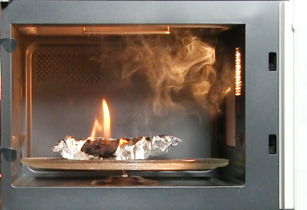 アルミはくに包んだサツマイモが発火する再現実験(NITE提供)