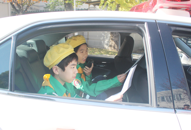 パトカーで広報活動する児童(豊橋市福岡小学校で)