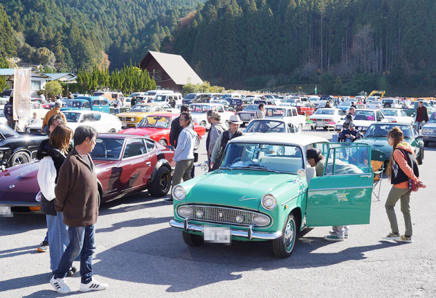 広場にはキッチンカーや雑貨の出店も並んだ。午後になると50台余りのクラシックカーがサブ会場の旧津具中学校へ移動し、列になって走る姿が見られた。