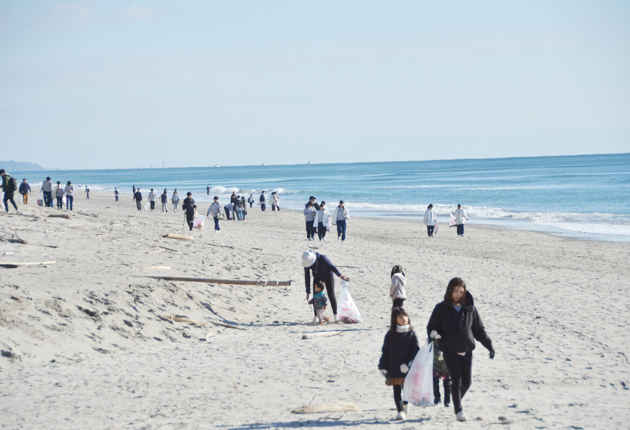 浜を歩き、ごみを拾う参加者(谷ノ口海岸で)