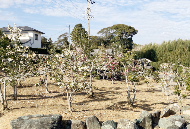 寺には、境内と「さざんか園」に300種4000本のサザンカが植えられている。そのシンボルが樹齢250年のサザンカ。3分咲きほどで、ピーク時には辺り一面をピンク色に染める。赤や白のほか、八重咲きなど多種多彩だ。