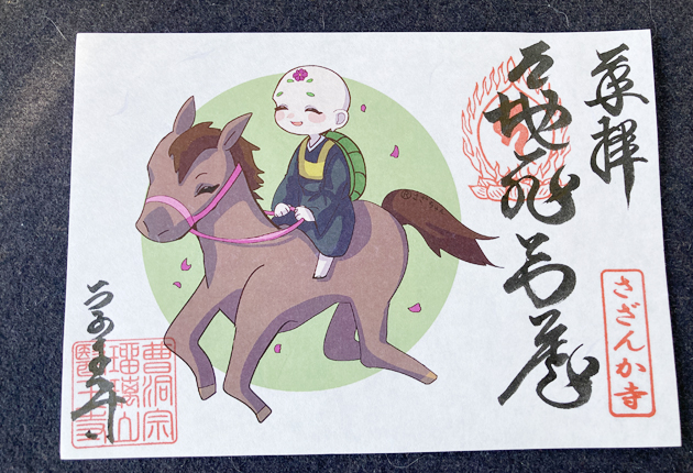 寺では、この期間から来年のえとの午(うま)が描かれた御朱印を配る。馬にまたがった医王寺のマスコット「さざちゃん」があしらわれている。