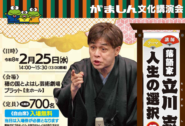 蒲郡信用金庫(蒲郡市)は来年2月25日午後2時から、豊橋市西小田原町の穂の国とよはし芸術劇場プラットに落語家の立川志らくさんを招き、「がましん文化講演会」を開く。入場無料。立川さんは「人生の選択」と題し、講演と落語を披露する。 定員は先着...