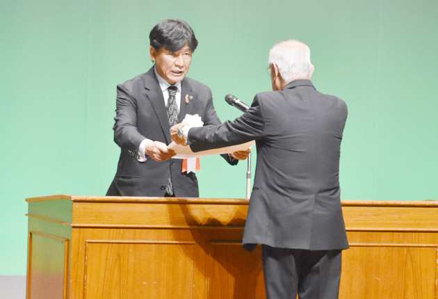 幡地さんに感謝状を贈呈する竹本市長㊧(豊川市文化会館で)