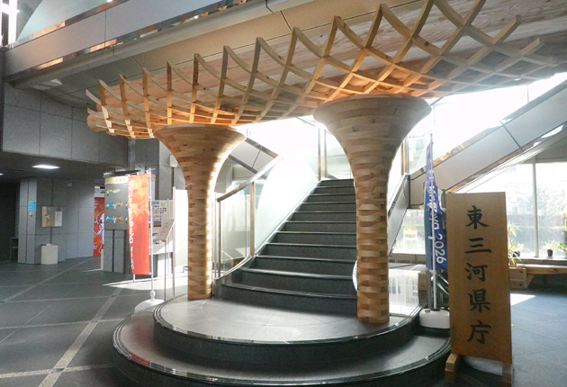 東三河県庁は、県産木材の利用を促す取り組みとして、東三河総合庁舎(豊橋市八町通)のエントランスに「木のゲート『いっぽん門』」を設置した。来庁者らに「木の良さ」を知ってもらい、民間施設や公共施設での県産木材の利用拡大を目指す。