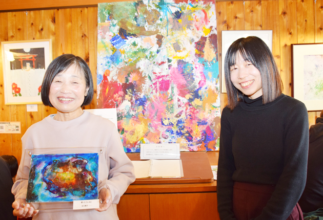 作品「夏から」を出展したのは、教室近くに住む梅田万里子さん(32)。ステンドグラスのようなきれいな色が出るように、夏の草木が生い茂った夜の景色を描いたという。梅田さんは小学4年から中学3年まで教室に通い、教室がある木曜日をいつも楽しみにしていた。大学などで外に出て、戻ってきた今、再び絵を描き始めた。「これからも長く楽しく描いていきたい」と笑顔で話す。