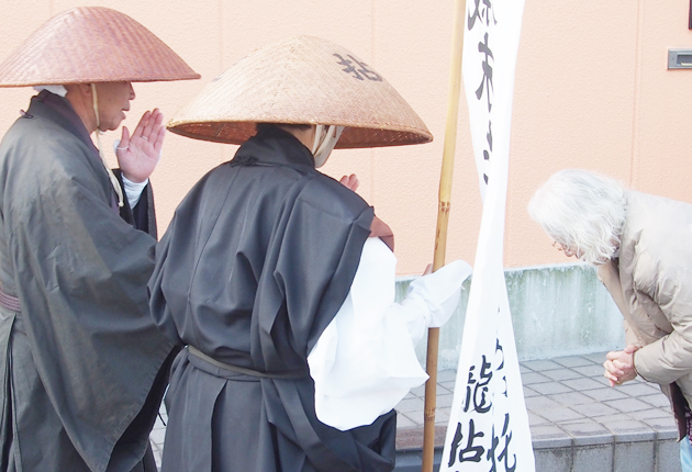 托鉢の参加者と寄付する人(豊橋市新吉町で)
