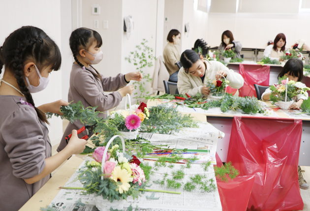 豊川産の花きについて学び、親子でフラワーアレンジメントを楽しむ「わい!わい!花育教室」が7日、JAひまわり総合集出荷センター(豊川市三上町)で行われた。18組42人が参加した。 JAひまわりバラ部会女性部・ローズメイト5人が指導した。 花...