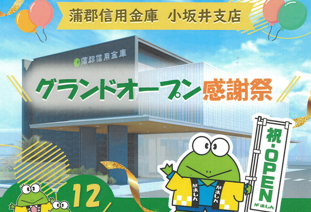 豊川市伊奈町の蒲郡信用金庫小坂井支店は、新装グランドオープン感謝祭の一環として12日、特別感謝デーを実施する。先月27日にグランドオープンした。 当日は契約者限定の空くじなしの「がまちゃんくじ大抽選会」が行われ、特賞のJTB旅行券1万円分...