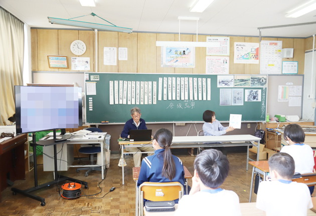 絵本を見せて読み聞かせをする佐久間さん(黒板の前の右側)=清田小学校で、提供