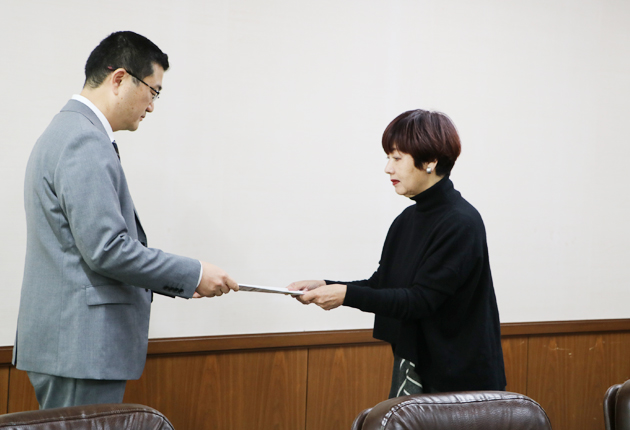 古橋代表から抗議文を受け取る村山秘書課長(豊橋市役所で)