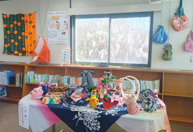 展示されているさまざまな風呂敷(豊橋市東部生涯学習センター飯村分館1階で)