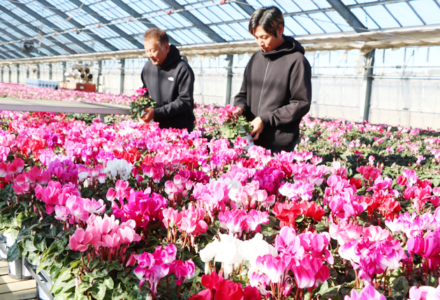 JAひまわり鉢物部会の西脇好次さん(54)=御津町=方では、温室5棟に4品種10色を栽培している。西脇さんは9日も午前8時から、息子の拓海さん(31)とともに、赤や白、ピンクや紅白のツートンなど、咲きそろったシクラメンを確認しながら出荷作業に追われた。「豊川市産のシクラメンは、寒さに強く、花持ちも良く、丈夫。冬場は花が少ないので、ぜひ長く楽しんでほしい」と話した。