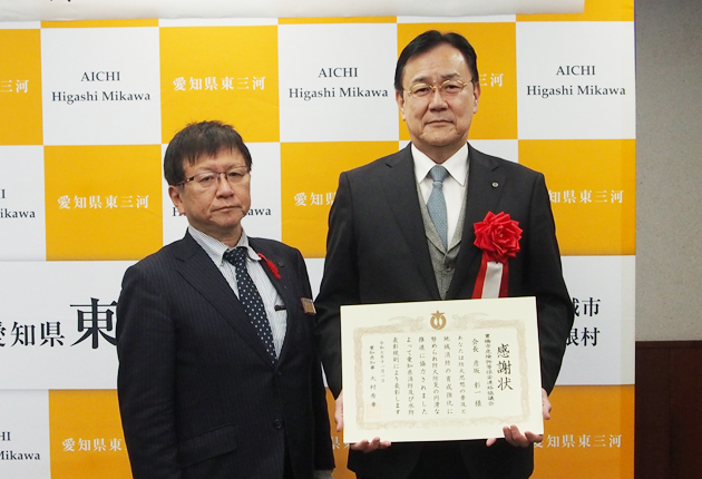 今年度愛知県定例表彰で「豊橋市危険物等保安連絡協議会」の会長を務める総合インフラ企業「サンソマテクノ」の彦坂彰一社長に9日、市八町通の東三河総合庁舎で、知事感謝状が贈られた。 江口幸雄副知事は彦坂社長に感謝状を手渡して「長年にわたり東三河...