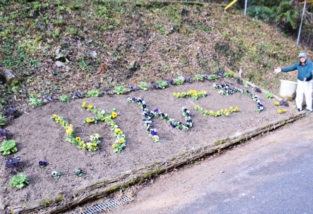 新城市海老須山地区の市道須山線沿いにある住民手作りの花壇に今年も、パンジーやハボタンを植えた花文字「けんこう」がお目見えした。