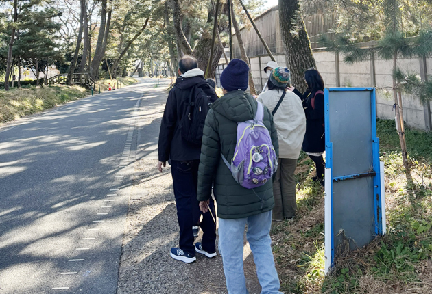 御油の松並木を散策する参加者ら(豊川市観光協会提供)