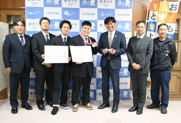 佐野さんは10日、クラスメイトで選手介添の野澤快生さん(18)と学校関係者、協力企業3社の人たちとともに豊川市役所を訪れ、竹本幸夫市長に同大会の結果を報告した。