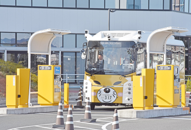 事故は10日午後1時40分ごろ、イオンモール豊川のバス停を出発する際に起きた。駐車場の自動精算機を通過する際、車体の右前頭部についたセンサーカメラが雨よけの屋根に接触。試乗していた関係者にけがはなく、屋根や車体の修復の必要はないという。