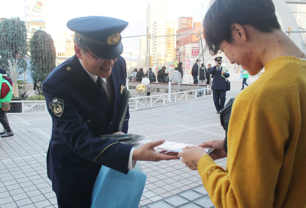 啓発品を配る署員ら(豊橋駅前で)
