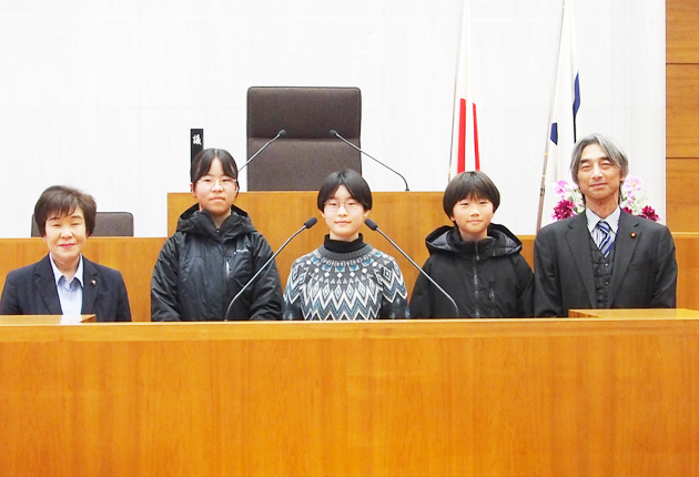 豊橋市は13日、豊橋市役所で、豊橋市議会議場見学会を開いた。豊橋市民愛市憲章「一日市議会議長」の公募に応募した17人のうち、希望した小学6年生2人と中学3年生1人、保護者ら3人が参加した。