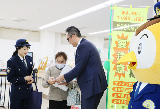 豊川署と豊橋信用金庫南大通支店は、15日、同支店で年金支給日に合わせて、特殊詐欺被害防止キャンペーンを行った。 キャンペーンでは県警マスコットキャラクター「コノハけいぶ」と同信金職員、警察署員ら計5人が出入り口付近に立ち、来店客に、国際電...