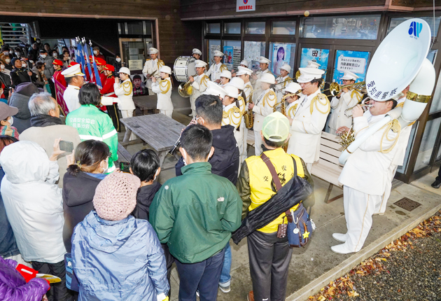 軒下で行進曲を披露する県警音楽隊(田口特産物振興センターで)