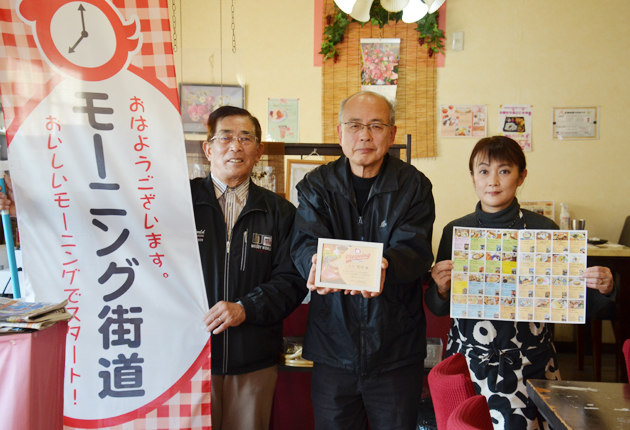 16日、豊川市三蔵子町の加盟店「喫茶花ごころ」で、主催する東三河モーニング街道研究会の中村誠孝会長から認定書が手渡された。「全店舗達成賞」としてコーヒーチケット5枚も贈られた。