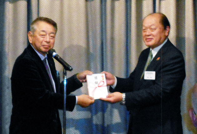 権田会長㊨へ目録を手渡す小野会長(提供)