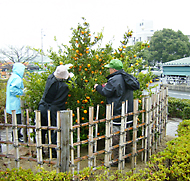 蒲郡市の中心地に住む住民でつくる「蒲形花ボランティアグループ」(竹内良一代表)は11日、同市旭町の旭公園で徳川家康ゆかりの木に大量に実ったミカンを収穫した。 この木は、静岡市の駿府城公園にある「徳川家康公お手植えみかん」の老木の枝を切り取...