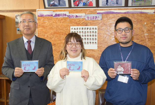 カレンダーを手にする、右から荒川さん、上田社長、野澤校長(新城市立舟着小学校で)