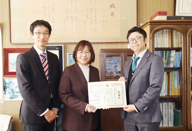 奥村校長㊥に賞状を渡した山本部会長㊨と藤田裕喜社会貢献委員長(蒲郡市立蒲郡西部小学校で)
