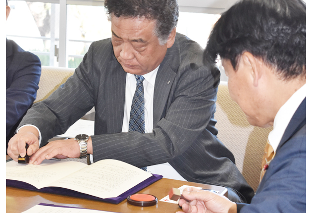 協定書に調印する竹本市長㊨と中角事務局長(豊川市役所で)