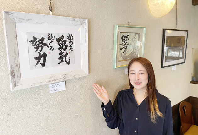 豊橋市の書道家で、優衣(美萌)として活動する兵藤優衣さん(30)が30日まで、同市駅前大通1のカフェ風花で初の個展「書 世界」を開催している。