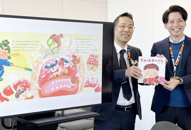 「ちゃっとおいでん」の動画と絵本を持つ豊橋市職員(市役所で)