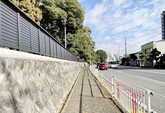 2車線化へ計画変更が承認された前田豊川線と豊川稲荷の石垣(豊川市幸町で)
