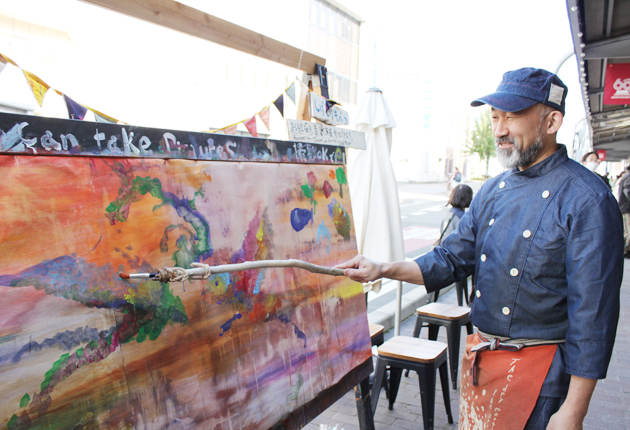 焼き菓子、弁当、野菜、服、本などさまざまなものが並ぶ中、大きなキャンパスが目を引くのがビアレストラン「獅子王」の前だ。店主の足立滋人さんがライブペインティングを行っている。「大人も子どもも描きたい人は皆歓迎」というように、道行く人が流木にくくりつけた柄の長い筆を持って、思い思いに色を載せていく。