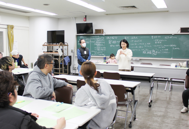 会員は現在70人。このうちろう者は20人弱だが、会場を見渡しても誰が健聴者かろう者かわからない。「月の世界」という声を出さないで伝える特訓中。隣に座った人を無言で紹介するミッションに、皆夢中だ。