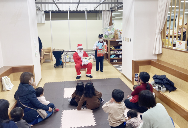 サンタが紹介されたあと、クリスマスの絵本や子どもたちが体を動かして楽しめる絵本の読み聞かせが行われた。子どもたちは声を合わせてサンタを数えたり、ジェスチャーをしたりして楽しんだ。最後にかんちょうサンタが絵本「ほげちゃん」を読み聞かせ、子どもたちは熱心に耳を傾けた。