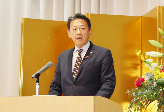 豊川蒲郡線整備促進同盟会の会長に就任し、あいさつする鈴木蒲郡市長(蒲郡商工会議所で)