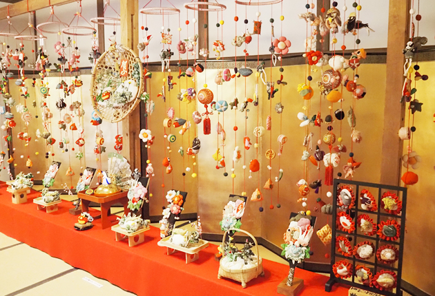 屋内には、豊橋市内のちりめん作家、豊田恵子さんとちりめん細工教室の生徒が作った正月をテーマにしたつるし飾りが40組ほど飾られ、華やかな色彩で本陣を彩っている。春の七草のちりめん細工も飾られ、正月らしい雰囲気を盛り上げる。