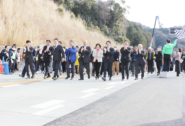 国道23号蒲郡BP開通に先立ち開かれたウオークイベントで、車道を歩く参加者ら(2月16日、蒲郡市内のBP本線で)